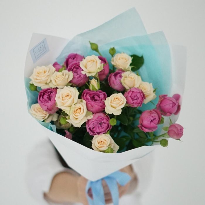 packaging design – 2 шт. gift message card – 1 шт. peony spray rose – 3 шт. free delivery – 1 шт. care instruction – 1 шт. spray rose cream – 4 шт.
