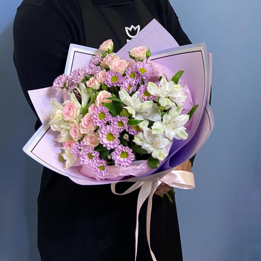Кустовая роза – 2 шт.Сантини – 3 шт.Альстромерия – 2 шт.Упаковка дизайнерская – 2 шт.Лента атласная – 1 шт.