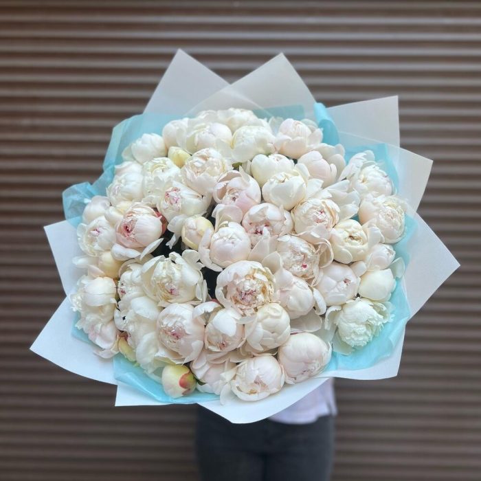 Лента атласная – 2 шт.Пион белый – 51 шт.Дизайнерская упаковка – 3 шт.