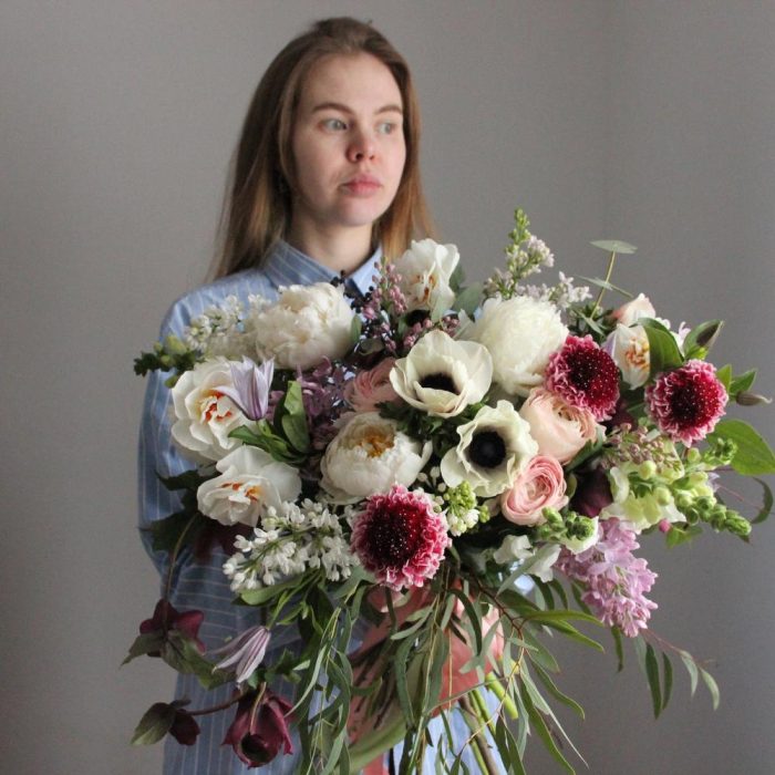 Анемон – 3 шт.Нарцисс – 3 шт.Пион – 3 шт.Сирень – 4 шт.Скабиоза – 3 шт.Эвкалипт – 5 шт.Лента атласная – 1 шт.Фисташка – 3 шт.Ранункулюс – 3 шт.Клематис – 2 шт.Львиный зев – 2 шт.Хелеборус – 2 шт.