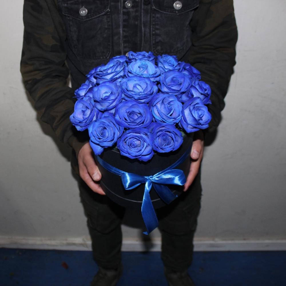 Лента атласная – 1 шт.Шляпная коробка – 1 шт.Синяя роза – 21 шт.