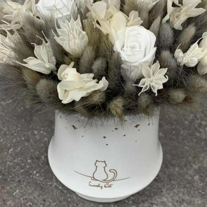 Кашпо керамическое – 1 шт.Роза стабилизированная – 3 шт.гортензия стабилизированная – 1 шт.лагурус пучок – 2 шт.Нигелла сухоцвет – 15 шт.