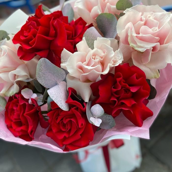 Французская роза – 9 шт. Эвкалипт – 1 шт. Упаковка дизайнерская – 1 шт.