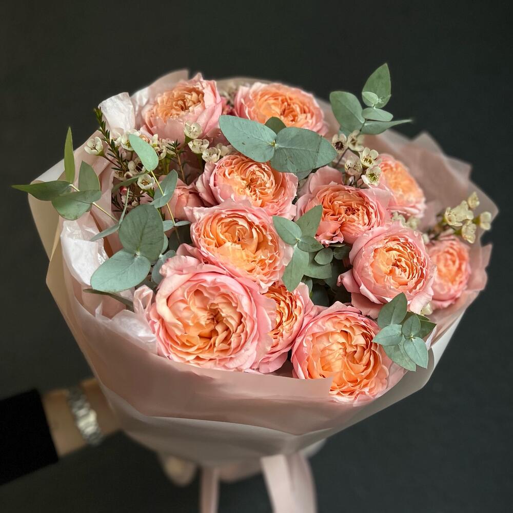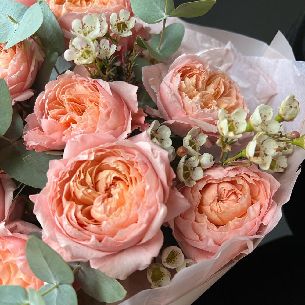 Букет из кустовой пионовидной розы, хамелациум и эвкалипта
