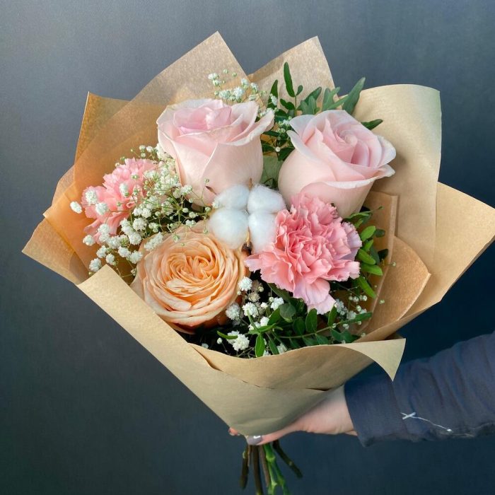 Роза Эквадор – 3 шт.Диантус – 2 шт.Хлопок – 1 шт.Гипсофила – 2 шт.Зелень – 3 шт.Упаковка дизайнерская – 3 шт.Лента атласная – 1 шт.