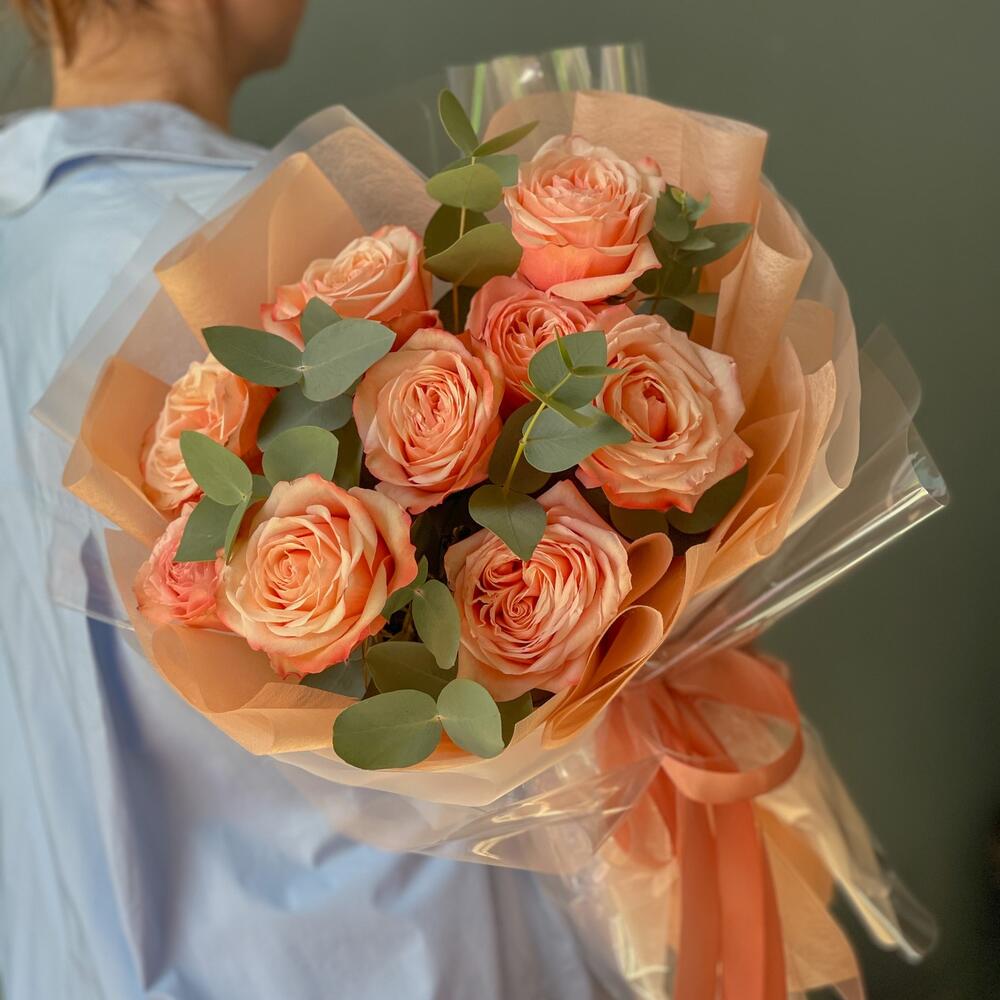 Лента – 2 шт.Эвкалипт – 2 шт.Упаковка – 2 шт.Кризал (подкормка) – 1 шт.Роза кахала – 9 шт.