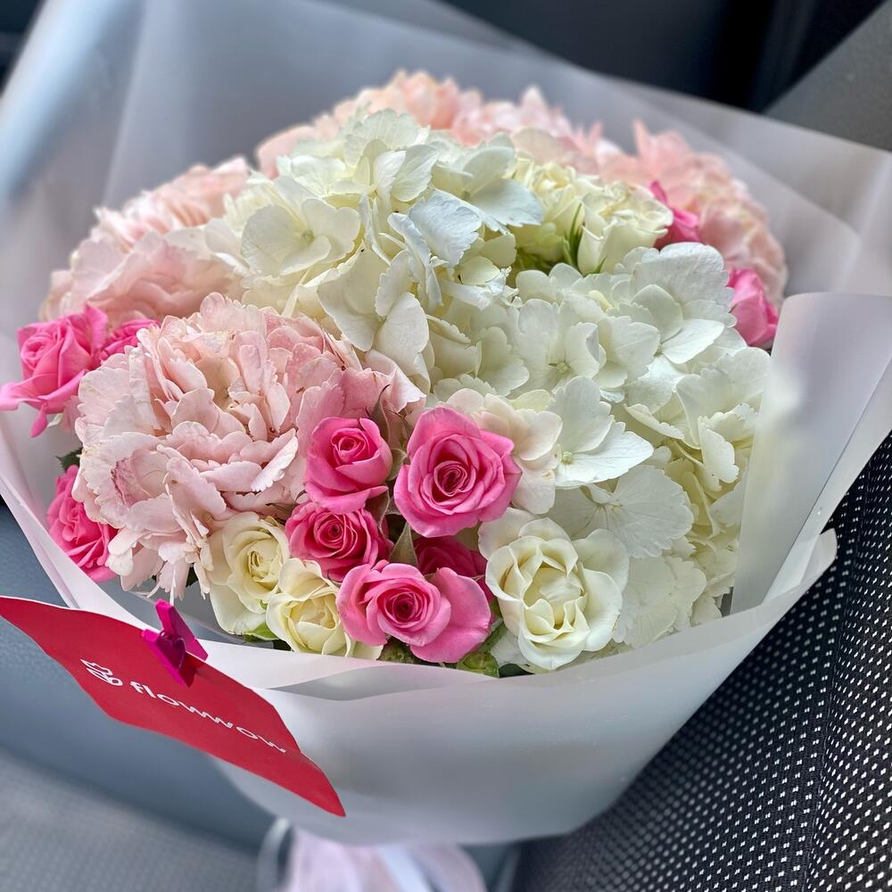 Гортензия – 3 шт.Роза кустовая – 4 шт.Лента атласная – 2 шт.Упаковка дизайнерская – 4 шт.