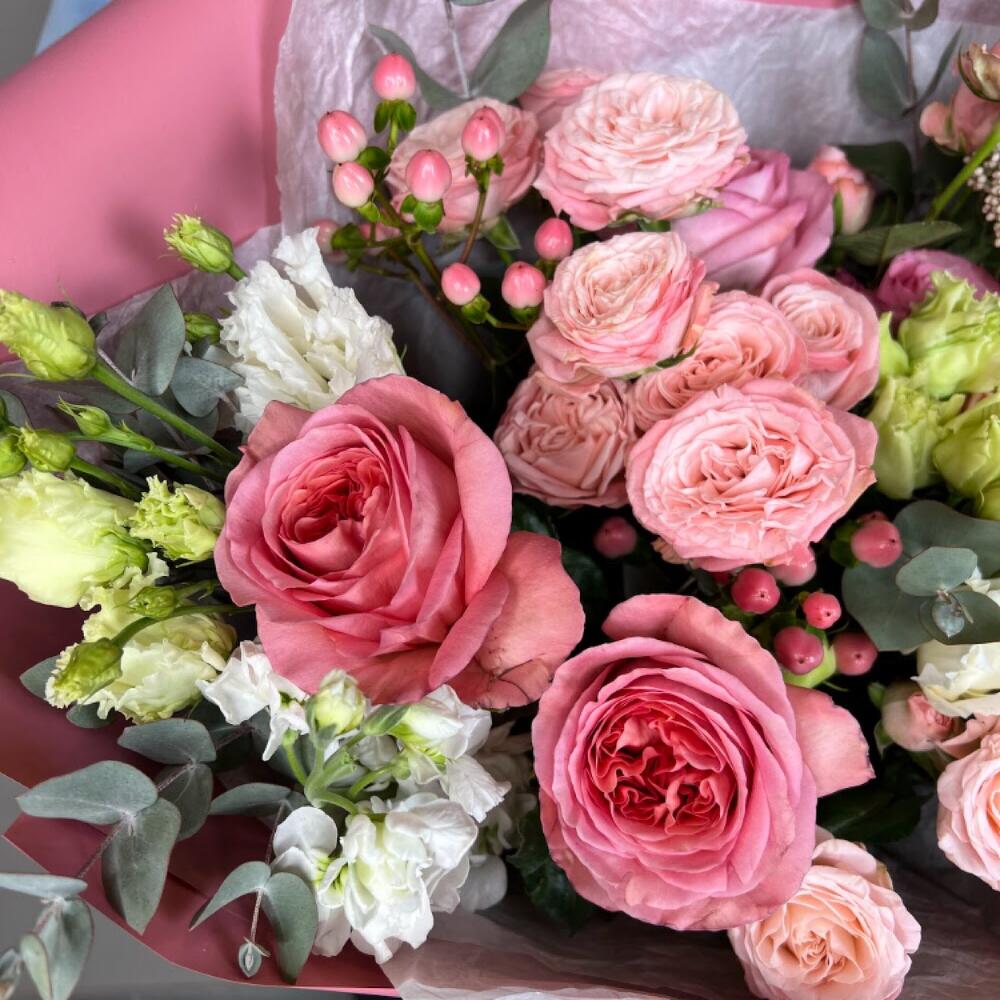 Гиперикум – 3 шт.Лизиантус – 2 шт.Маттиола – 3 шт.Озотамнус – 2 шт.Эвкалипт – 2 шт.Фисташка – 2 шт.Роза пионовидная – 7 шт.Роза кустовая пионовидная – 4 шт.Дизайнерская упаковка – 1 шт.комплимент от polyanka – 1 шт.