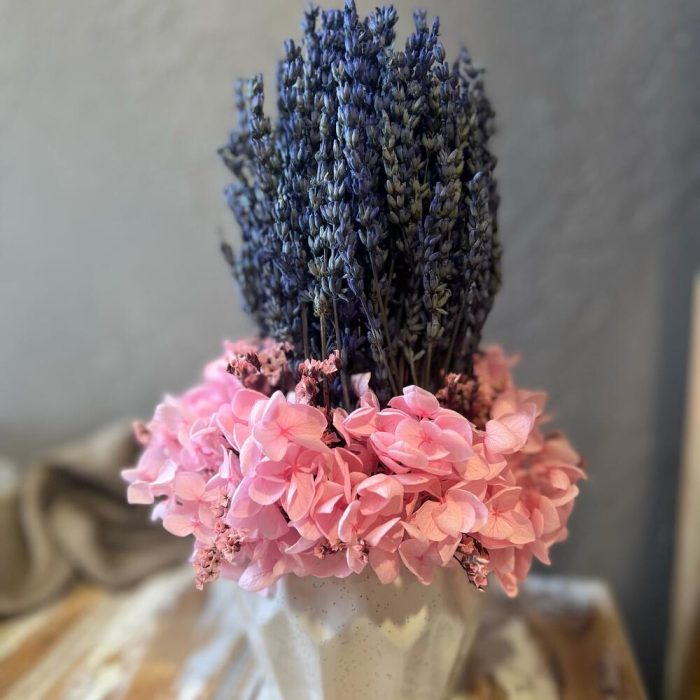 лаванда стабилизированная пучок – 1 шт.гортензия стабилизированная – 1 шт.Лимониум – 3 шт.Керамическое кашпо – 1 шт.